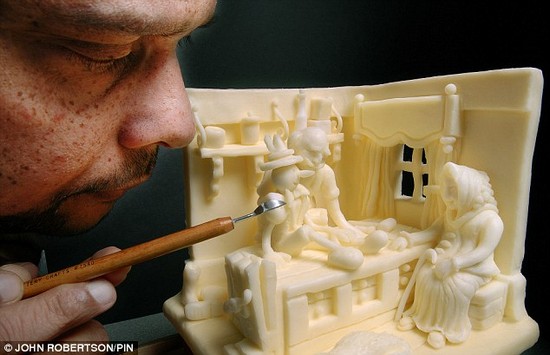 You will be amazed with the precision of the details of his butter-sculptures. His concentration has to be so high he has to hold his breath while creating sculptures to avoid unwanted movements of his hands.